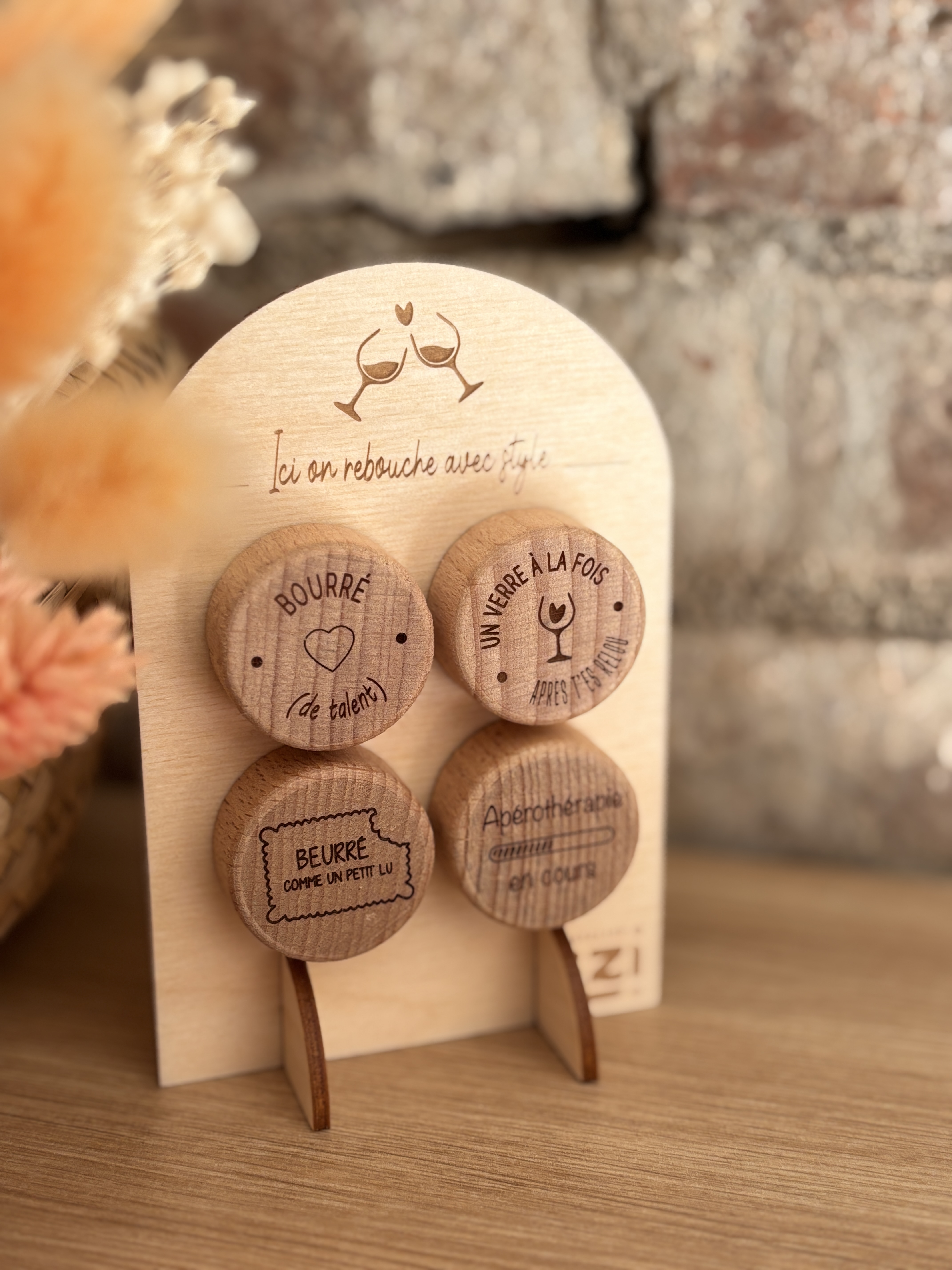 Offrez une touche d’humour et d’élégance à vos apéros avec notre mini présentoir 4 bouchons de bouteille gravés !