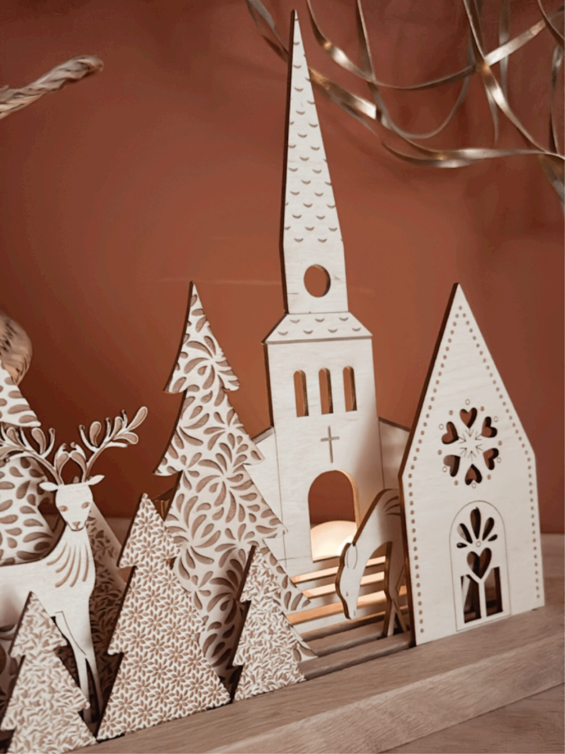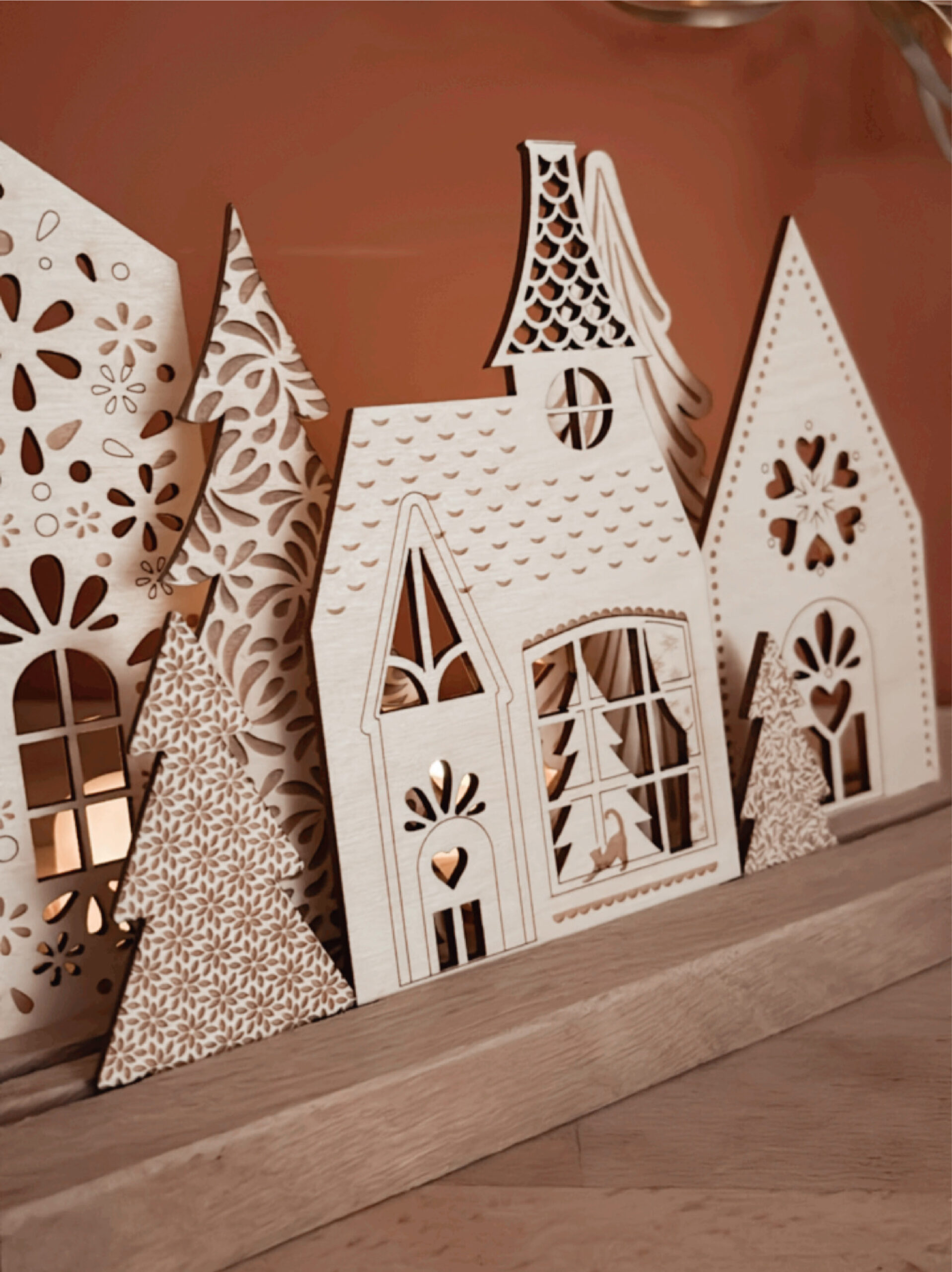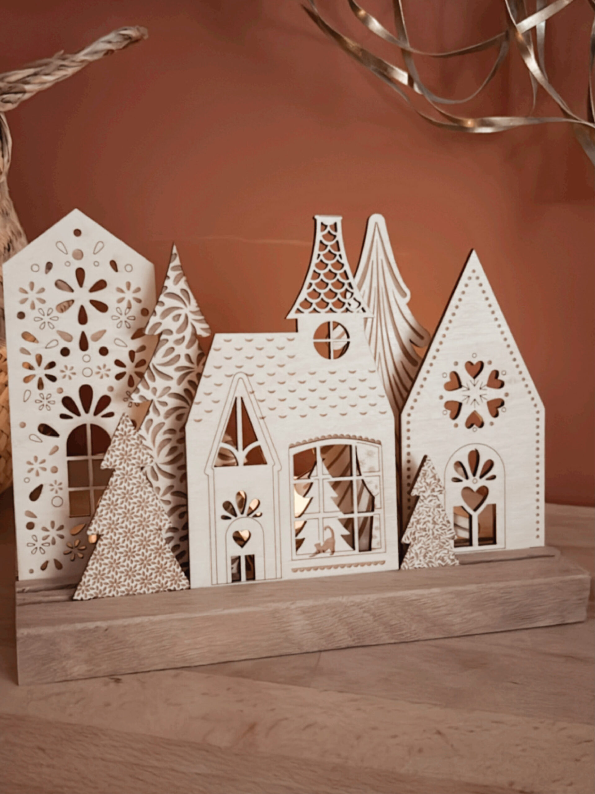 Apportez la magie des fêtes dans votre intérieur avec ce village de Noël en bois, entièrement fabriqué et gravé dans notre atelier à Chartres.